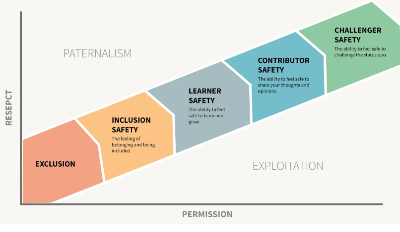 This diagram visually emphasizes the progression from exclusion to full psychological safety, highlighting how respect and permission interact to create a safe environment for learning, contribution, and challenging ideas.
